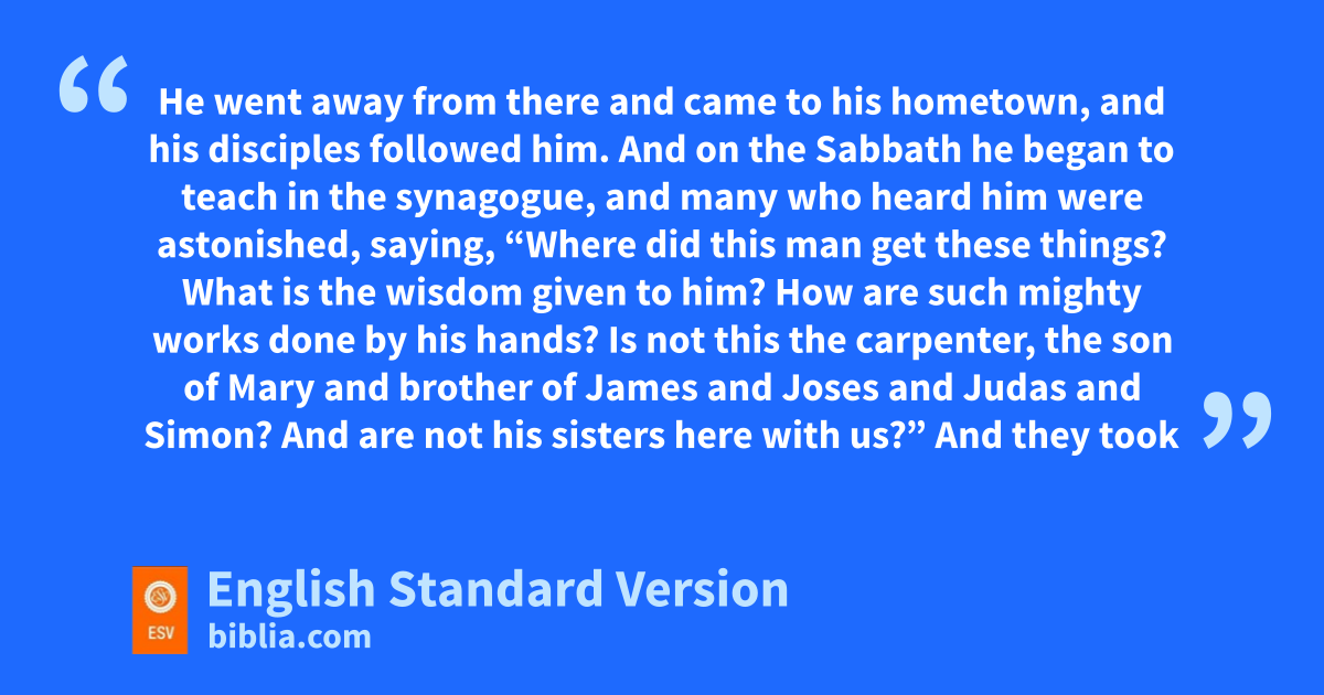 6 bHe went away from there and came to chis hometown, and his disciples followed him. 2 And don the Sabbath he began to teach in the synagogue, and emany who heard him were astonished, saying, “Where did this man get these things? What is the wisdom given to him? How are such mighty works done by his hands? 3 fIs not this gthe carpenter,1 the son of Mary and hbrother of James and Joses and Judas and Simon? And are not his sisters here with us?” And ithey took offense at him. 4 And Jesus said to them, j“A prophet is not without honor, except in his hometown and among his relatives and in his own household.” 5 And khe could do no mighty work there, except that lhe laid his hands on a few sick people and healed them. 6 And mhe marveled because of their unbelief.