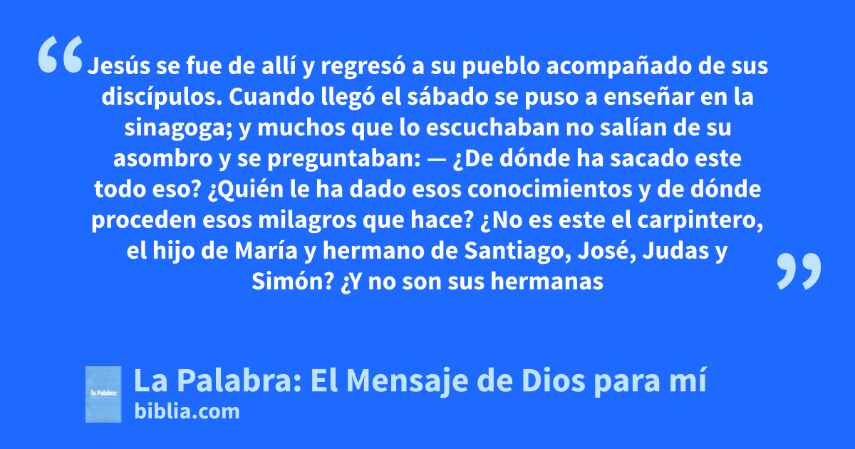 6 Jesús se fue de allí y regresó a su pueblo acompañado de sus discípulos. 2 Cuando llegó el sábado se puso a enseñar en la sinagoga; y muchos que lo escuchaban no salían de su asombro y se preguntaban: