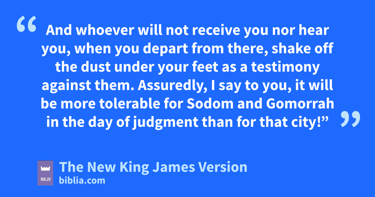 10 mAlso He said to them, “In whatever place you enter a house, stay there till you depart from that place. 11 nAnd 1whoever will not receive you nor hear you, when you depart from there, oshake off the dust under your feet as a testimony against them. 2Assuredly, I say to you, it will be more tolerable for Sodom and Gomorrah in the day of judgment than for that city!”