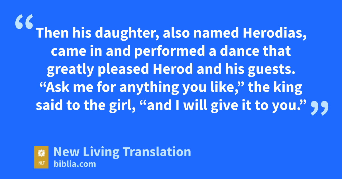 21 Herodias’s chance finally came on Herod’s birthday. He gave a party for his high government officials, army officers, and the leading citizens of Galilee. 22 Then his daughter, also named Herodias,* came in and performed a dance that greatly pleased Herod and his guests. “Ask me for anything you like,” the king said to the girl, “and I will give it to you.” 23 He even vowed, “I will give you whatever you ask, up to half my kingdom!”