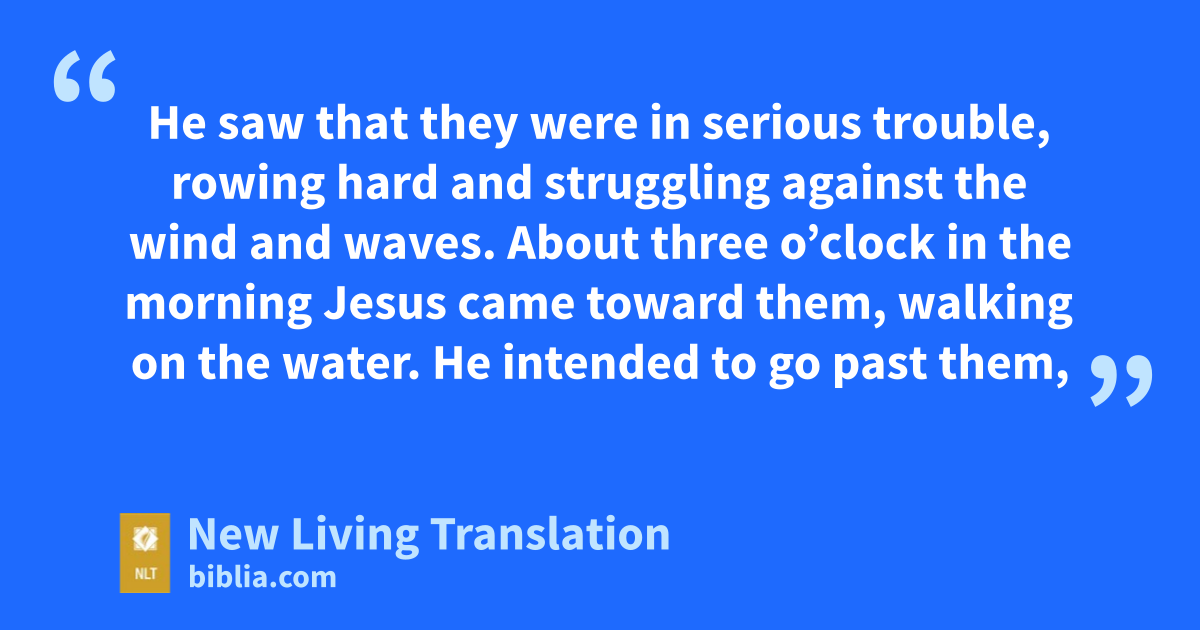 47 Late that night, the disciples were in their boat in the middle of the lake, and Jesus was alone on land. 48 He saw that they were in serious trouble, rowing hard and struggling against the wind and waves. About three o’clock in the morning* Jesus came toward them, walking on the water. He intended to go past them, 49 but when they saw him walking on the water, they cried out in terror, thinking he was a ghost. 50 They were all terrified when they saw him.