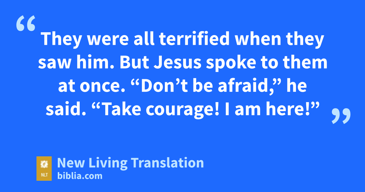 But Jesus spoke to them at once. “Don’t be afraid,” he said. “Take courage! I am here!* ” 51 Then he climbed into the boat, and the wind stopped. They were totally amazed, 52 for they still didn’t understand the significance of the miracle of the loaves. Their hearts were too hard to take it in.