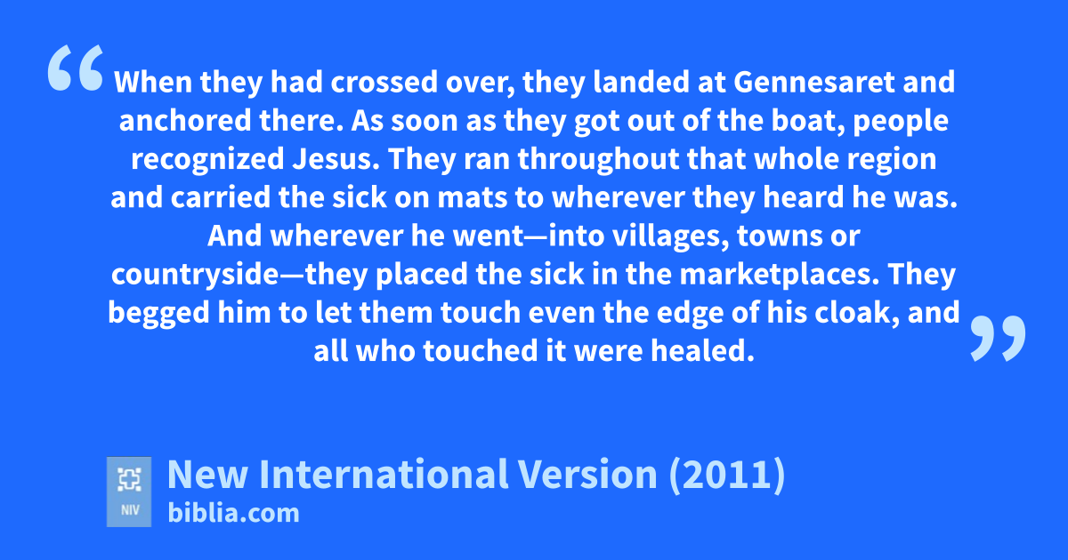 53 When they had crossed over, they landed at Gennesaret and anchored there.e 54 As soon as they got out of the boat, people recognized Jesus. 55 They ran throughout that whole region and carried the sick on mats to wherever they heard he was. 56 And wherever he went—into villages, towns or countryside—they placed the sick in the marketplaces. They begged him to let them touch even the edge of his cloak,f and all who touched it were healed.