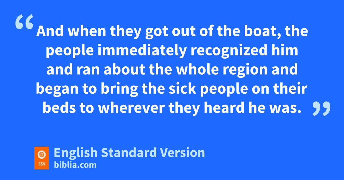 53 hWhen they had crossed over, they came to land at iGennesaret and moored to the shore. 54 And when they got out of the boat, the people immediately jrecognized him 55 and ran about the whole region and began to bring kthe sick people lon their beds to wherever they heard he was. 56 And wherever he came, in villages, cities, or countryside, mthey laid the sick in the marketplaces and implored him that they might touch even nthe fringe of his garment. And oas many as touched it were made well.