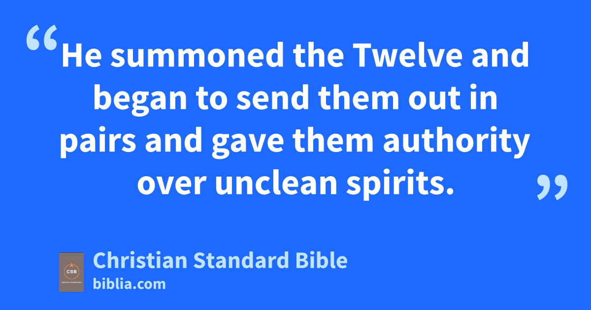 7 Hebm summonedbn the Twelvebo and began to sendbp them out in pairs and gave them authority over uncleanbq spirits.br 8 He instructed them to take nothing for the road except a staff—no bread, no traveling bag,bs no money in their belts, 9 but to wear sandals and not put on an extra shirt.bt 10 He said to them, “Whenever you enter a house, stay there until you leave that place. 11 If any place does not welcomea you or listen to you, when you leave there, shake the dust off your feetb as a testimonyc against them.”A 12 So they went out and preachedd that people should repent.e 13 They drove out many demons,f anointedg many sickh people with oili and healed them.j