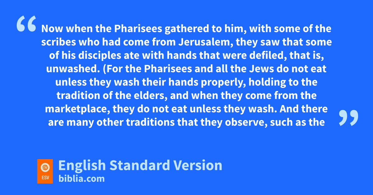 7 pNow when the Pharisees gathered to him, with some of the scribes qwho had come from Jerusalem, 2 they saw that some of his disciples ate with hands that were rdefiled, that is, unwashed. 3 (For the Pharisees and all the Jews do not eat unless they wash their hands properly,1 holding to sthe tradition of tthe elders, 4 and when they come from the marketplace, they do not eat unless they wash.2 And there are many other traditions that they observe, such as uthe washing of vcups and pots and copper vessels and dining couches.3) 5 And the Pharisees and the scribes asked him, “Why do your disciples not walk according to sthe tradition of tthe elders, wbut eat with rdefiled hands?” 6 And he said to them, “Well did Isaiah prophesy of you xhypocrites, as it is written,