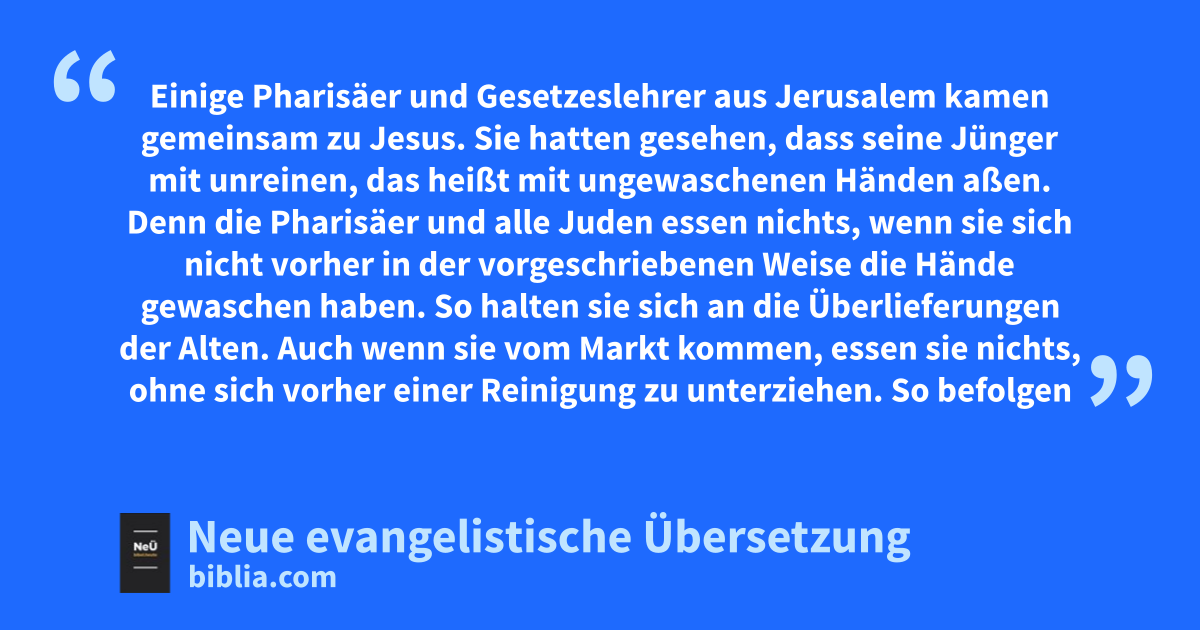 7 1 Einige Pharisäer und Gesetzeslehrer aus Jerusalem kamen gemeinsam zu Jesus. 2 Sie hatten gesehen, dass seine Jünger mit unreinen, das heißt mit ungewaschenen Händen aßen. 3 Denn die Pharisäer und alle Juden essen nichts, wenn sie sich nicht vorher in der vorgeschriebenen Weise die Hände gewaschen haben. So halten sie sich an die Überlieferungen der Alten. 4 Auch wenn sie vom Markt kommen, essen sie nichts, ohne sich vorher einer Reinigung zu unterziehen. So befolgen sie noch eine Reihe anderer überlieferter Vorschriften über das Reinigen von Bechern, Krügen, Kupfergefäßen und Sitzpolstern. 5 Die Pharisäer und die Gesetzeslehrer fragten ihn also: „Warum richten deine Jünger sich nicht nach den Vorschriften, die uns von den Vorfahren überliefert sind, und essen mit ungewaschenen Händen?“ 6 „Ihr Heuchler! Auf euch trifft genau zu, was Jesaja geweissagt hat“, gab Jesus zur Antwort. „So steht es nämlich geschrieben:
