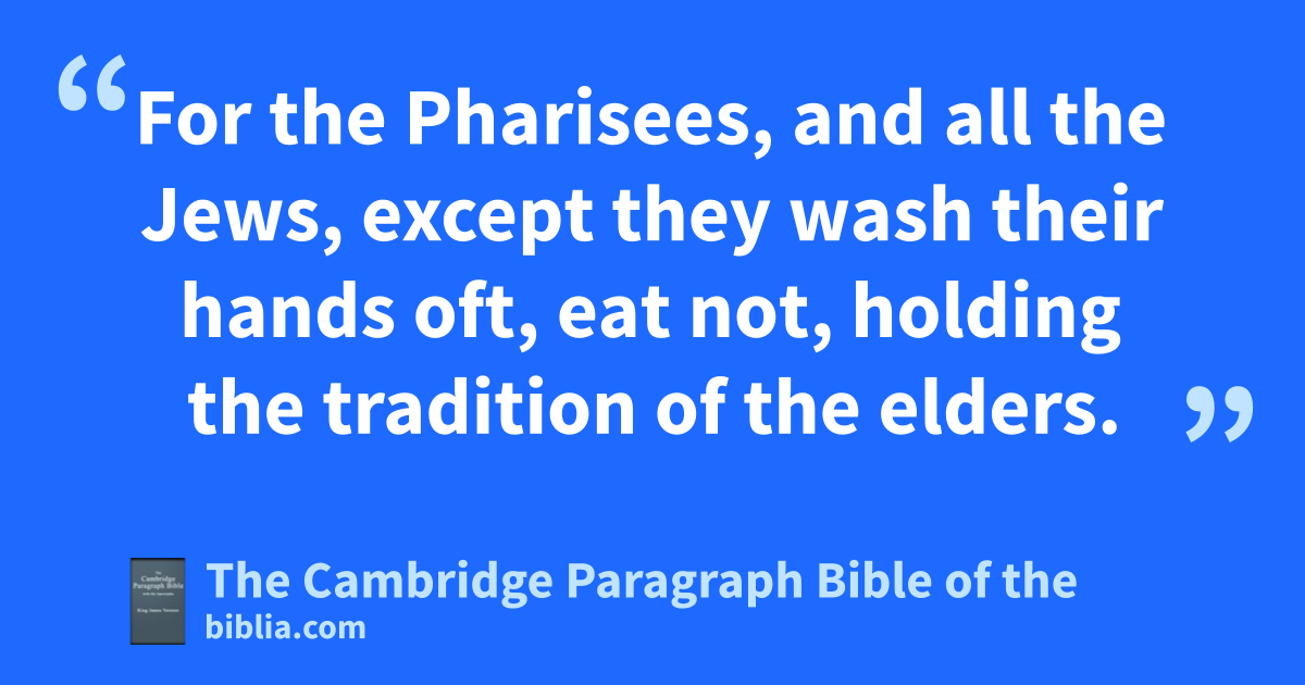 VII. Then acame together unto him the Pharisees, and certain of the scribes, which came from Jerusalem. 2 And when they saw some of his disciples eat bread with * defiled, that is to say, bwith unwashen, hands, they found fault. 3 For the Pharisees, and all the Jews, except they wash their hands * oft, eat not, holding the tradition of the elders. 4 And when they come from the market, except they cwash, they eat not. And many other things there be, which they have received to hold, as the cwashing of dcups, and * pots, brasen vessels, and of * tables. 5 Then the Pharisees and scribes asked him, Why walk not thy disciples according to the tradition of the elders, but eat bread bwith unwashen hands? 6 He answered and said unto them, Well hath Esaias prophesied of you hypocrites, as it is written, eThis people honoureth me with their lips, but their heart is far from me. 7 Howbeit in vain do they worship me, teaching for doctrines the commandments of men. 8 For laying aside the commandment of God, ye hold the tradition of men, as fthe washing of pots and cups: gand many other such like things ye do. 9 And he said unto them, Full well ye * hreject the commandment of God, that ye may keep your own tradition. 10 For Moses said, hhHonour thy father and thy mother; and, iWhoso curseth father or mother, let him die the death. 11 But ye say, If a man shall say to his father or mother, It is iiCorban, that is to say, a gift, by whatsoever thou mightest be profited by me; he shall be free. 12 And ye suffer him no more to do ought for his father or his mother; 13 making the word of God of none effect through your tradition, which ye have delivered: gand many such like things do ye.