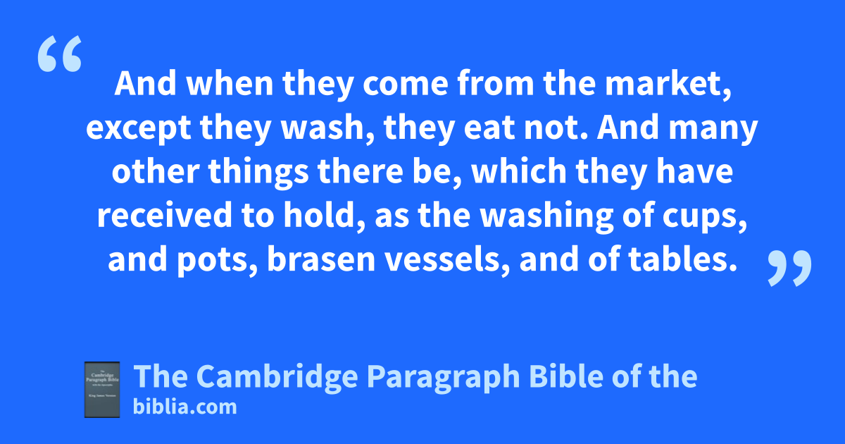 VII. Then acame together unto him the Pharisees, and certain of the scribes, which came from Jerusalem. 2 And when they saw some of his disciples eat bread with * defiled, that is to say, bwith unwashen, hands, they found fault. 3 For the Pharisees, and all the Jews, except they wash their hands * oft, eat not, holding the tradition of the elders. 4 And when they come from the market, except they cwash, they eat not. And many other things there be, which they have received to hold, as the cwashing of dcups, and * pots, brasen vessels, and of * tables. 5 Then the Pharisees and scribes asked him, Why walk not thy disciples according to the tradition of the elders, but eat bread bwith unwashen hands? 6 He answered and said unto them, Well hath Esaias prophesied of you hypocrites, as it is written, eThis people honoureth me with their lips, but their heart is far from me. 7 Howbeit in vain do they worship me, teaching for doctrines the commandments of men. 8 For laying aside the commandment of God, ye hold the tradition of men, as fthe washing of pots and cups: gand many other such like things ye do. 9 And he said unto them, Full well ye * hreject the commandment of God, that ye may keep your own tradition. 10 For Moses said, hhHonour thy father and thy mother; and, iWhoso curseth father or mother, let him die the death. 11 But ye say, If a man shall say to his father or mother, It is iiCorban, that is to say, a gift, by whatsoever thou mightest be profited by me; he shall be free. 12 And ye suffer him no more to do ought for his father or his mother; 13 making the word of God of none effect through your tradition, which ye have delivered: gand many such like things do ye.