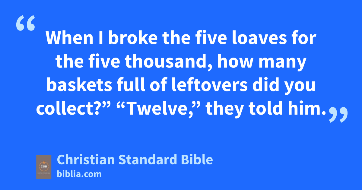 “Seven,” they said. 6 He commanded the crowd to sit down on the ground. Taking the seven loaves, he gave thanks, brokeab them, and gave them to his disciples to set before the people. So they served them to the crowd. 7 They also had a few small fish, and after he had blessed them, he said these were to be served as well. 8 They ate and were satisfied. Then they collected seven large baskets of leftover pieces. 9 About four thousand were there. He dismissed them. 10 And he immediately got into the boat with his disciples and went to the district of Dalmanutha.