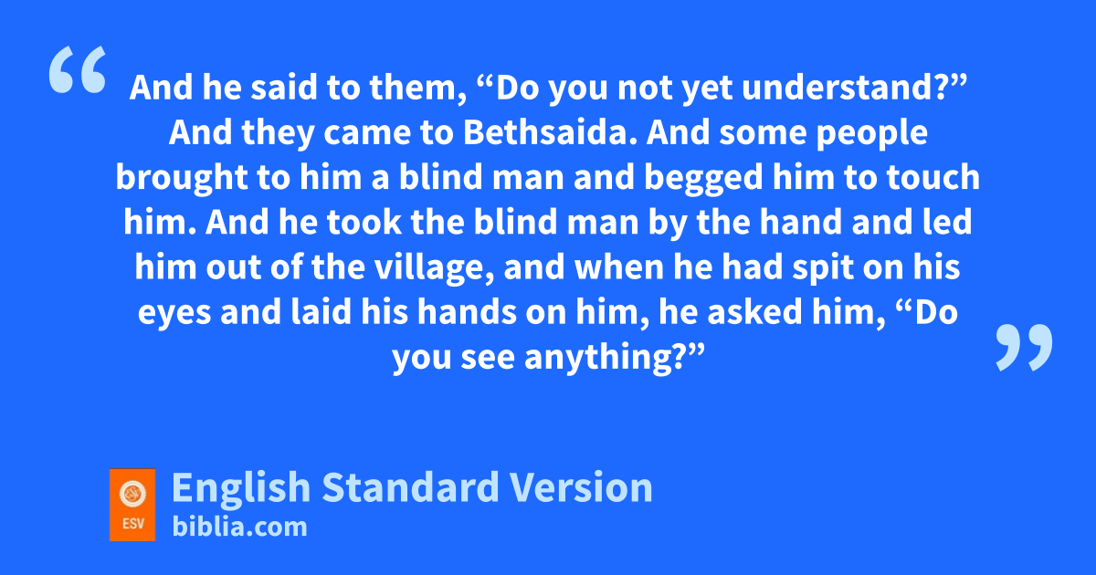 22 And they came jto Bethsaida. And some people brought to him a blind man and begged him to touch him. 23 And khe took the blind man by the hand and led him out of the village, and when khe had lspit on his eyes and mlaid his hands on him, he asked him, “Do you see anything?” 24 And he looked up and said, “I see people, but they look like trees, walking.” 25 Then Jesus3 laid his hands on his eyes again; and he opened his eyes, his sight was restored, and he saw everything clearly. 26 And he sent him to his home, saying, n“Do not even enter the village.”