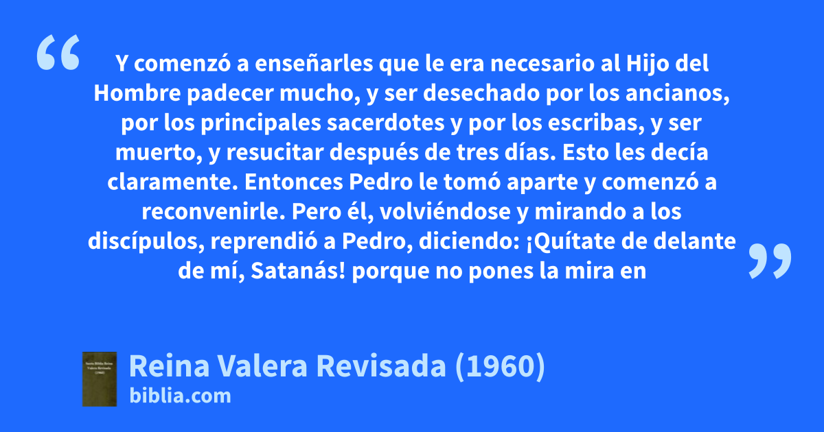 31Y comenzó a enseñarles que le era necesario al Hijo del Hombre padecer mucho, y ser desechado por los ancianos, por los principales sacerdotes y por los escribas, y ser muerto, y resucitar después de tres días. 32Esto les decía claramente. Entonces Pedro le tomó aparte y comenzó a reconvenirle. 33Pero él, volviéndose y mirando a los discípulos, reprendió a Pedro, diciendo: ¡Quítate de delante de mí, Satanás! porque no pones la mira en las cosas de Dios, sino en las de los hombres.