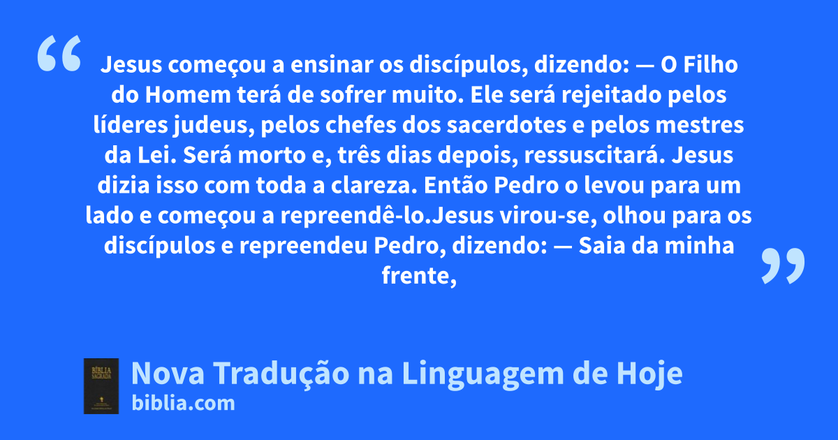 32 Jesus dizia isso com toda a clareza. Então Pedro o levou para um lado e começou a repreendê-lo.33 Jesus virou-se, olhou para os discípulos e repreendeu Pedro, dizendo: