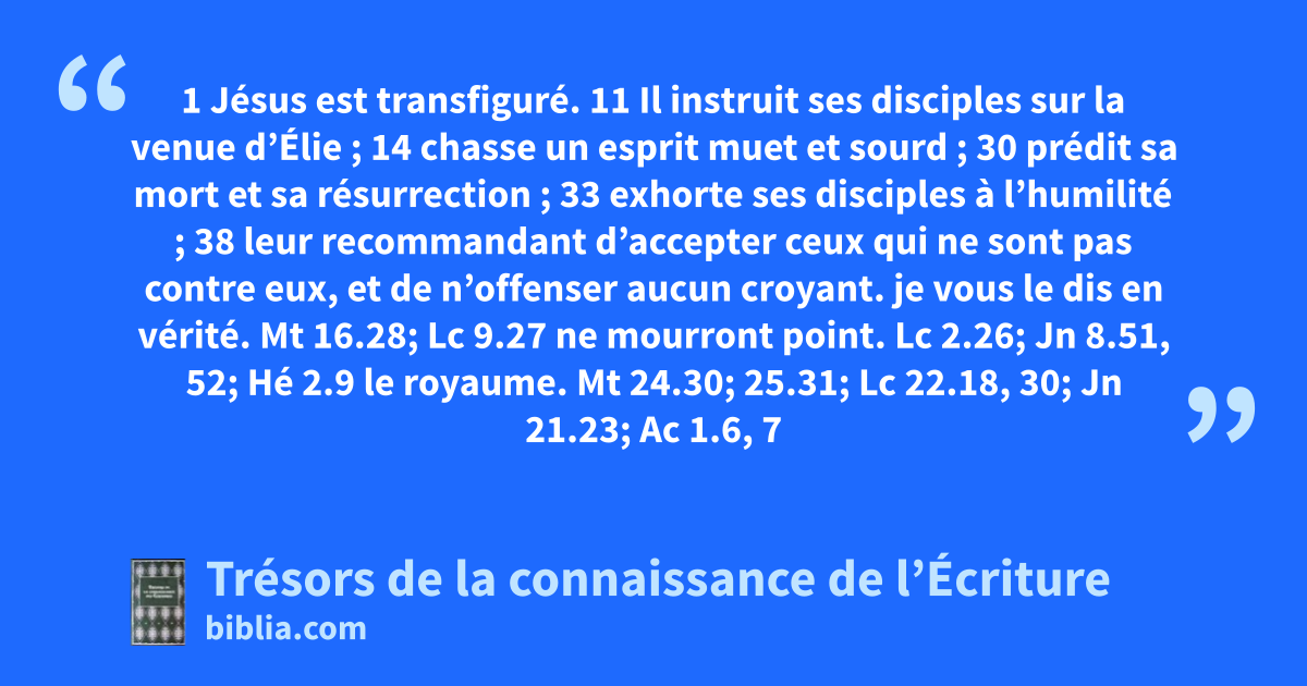 1 Jésus est transfiguré. 11 Il instruit ses disciples sur la venue d’Élie ; 14 chasse un esprit muet et sourd ; 30 prédit sa mort et sa résurrection ; 33 exhorte ses disciples à l’humilité ; 38 leur recommandant d’accepter ceux qui ne sont pas contre eux, et de n’offenser aucun croyant.