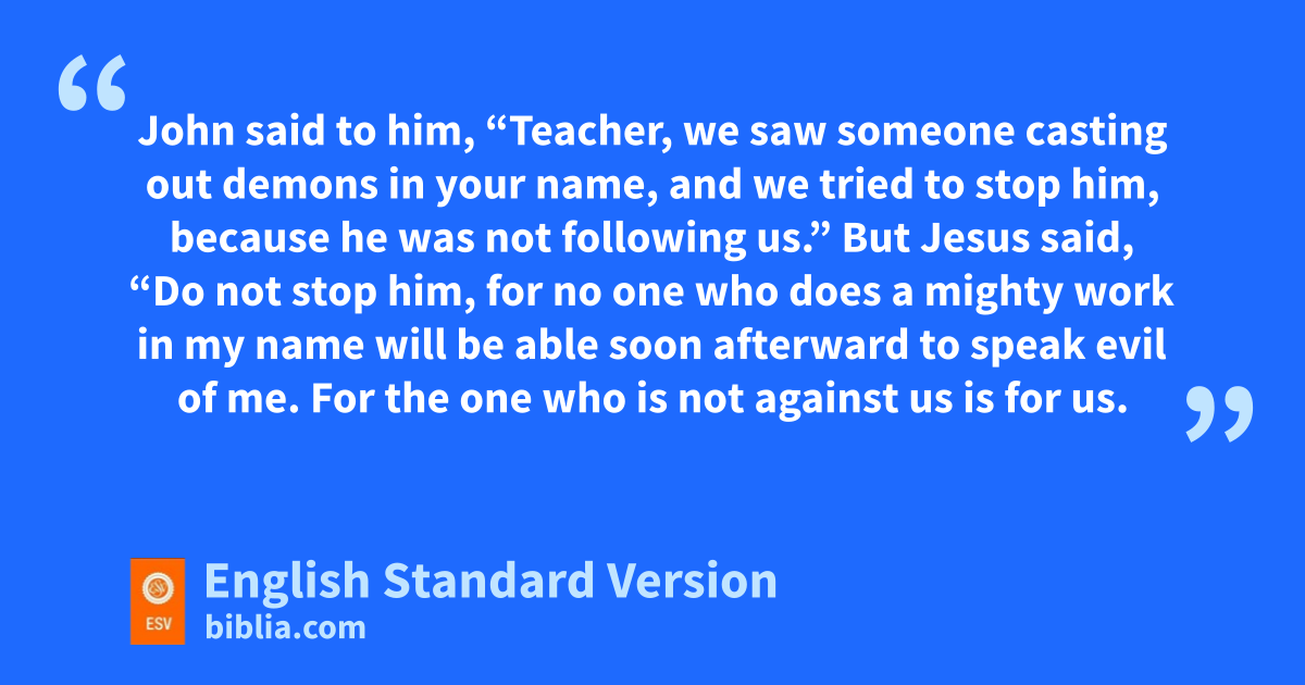 38 fJohn said to him, “Teacher, we saw someone gcasting out demons in your name,6 and hwe tried to stop him, because he was not following us.” 39 But Jesus said, “Do not stop him, for no one who does a mighty work in my name will be able soon afterward to speak evil of me. 40 iFor the one who is not against us is for us. 41 For truly, I say to you, jwhoever gives you a cup of water to drink because7 you belong to Christ will by no means lose his reward.