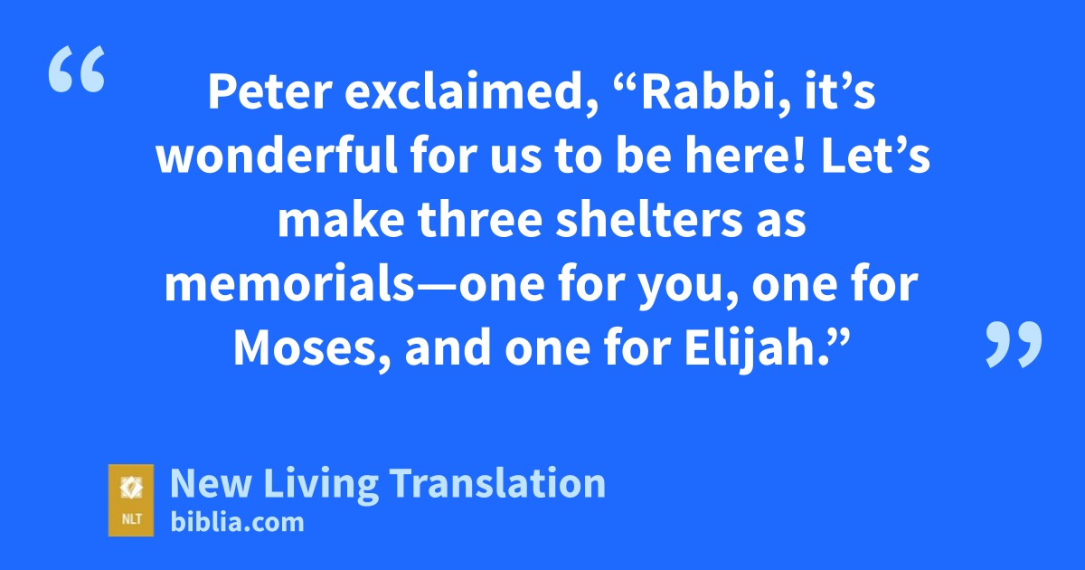 5 Peter exclaimed, “Rabbi, it’s wonderful for us to be here! Let’s make three shelters as memorials* —one for you, one for Moses, and one for Elijah.” 6 He said this because he didn’t really know what else to say, for they were all terrified.