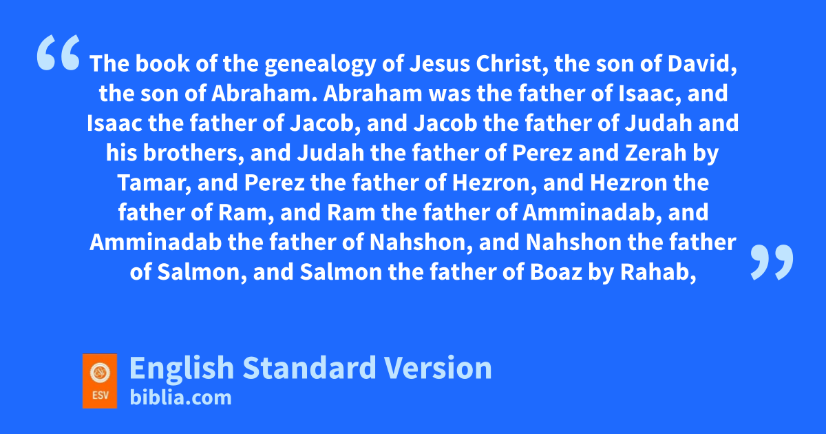 2 dAbraham was the father of Isaac, and eIsaac the father of Jacob, and fJacob the father of Judah and his brothers, 3 and gJudah the father of Perez and Zerah by Tamar, and Perez the father of Hezron, and Hezron the father of Ram,1 4 and Ram the father of Amminadab, and Amminadab the father of Nahshon, and Nahshon the father of Salmon, 5 and Salmon the father of Boaz by hRahab, and Boaz the father of Obed by Ruth, and Obed the father of Jesse, 6 and iJesse the father of David the king.