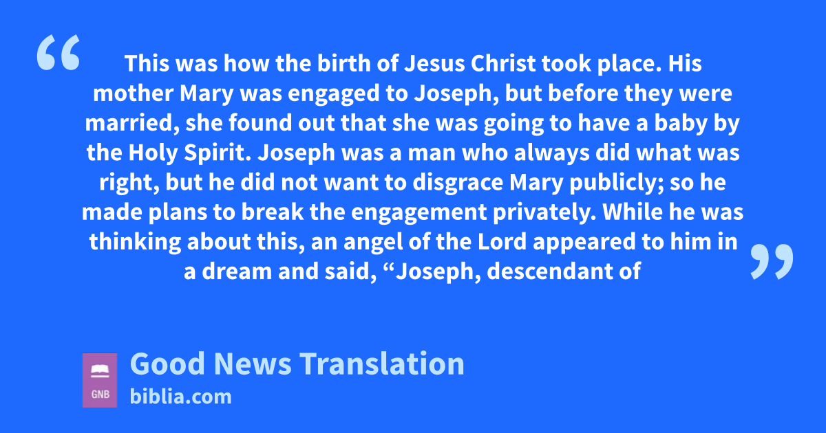 18 *This was how the birth of Jesus Christ took place. His mother Mary was engaged to Joseph, but before they were married, she found out that she was going to have a baby by the Holy Spirit. 19Joseph was a man who always did what was right, but he did not want to disgrace Mary publicly; so he made plans to break the engagement privately. 20While he was thinking about this, an angel of the Lord appeared to him in a dream and said, “Joseph, descendant of David, do not be afraid to take Mary to be your wife. For it is by the Holy Spirit that she has conceived. 21*She will have a son, and you will name him Jesus—because he will save his people from their sins.”