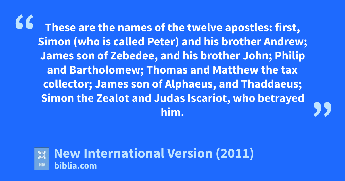 2 These are the names of the twelve apostles: first, Simon (who is called Peter) and his brother Andrew; James son of Zebedee, and his brother John; 3 Philip and Bartholomew; Thomas and Matthew the tax collector; James son of Alphaeus, and Thaddaeus; 4 Simon the Zealot and Judas Iscariot, who betrayed him.c