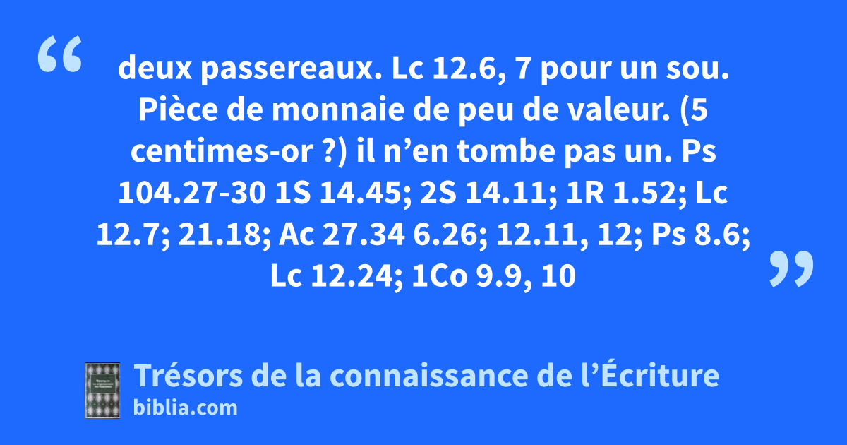deux passereaux. Lc 12.6, 7 pour un sou. Pièce de monnaie de peu de valeur. (5 centimes-or ?) il n’en tombe pas un. Ps 104.27-30