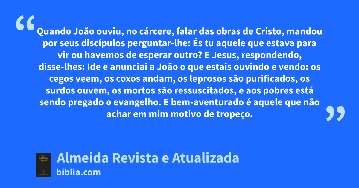 2 Quando João ouviu, no cárcere, falar das obras de Cristo, mandou por seus discípulos perguntar-lhe: 3 És tu aquele que estava para vir ou havemos de esperar outro? 4 E Jesus, respondendo, disse-lhes: Ide e anunciai a João o que estais ouvindo e vendo: 5 os cegosa veem, os coxos andam, os leprosos são purificados, os surdos ouvem, os mortos são ressuscitados, e aos pobres está sendo pregado o evangelhob. 6 E bem-aventurado é aquele que não achar em mim motivo de tropeço.