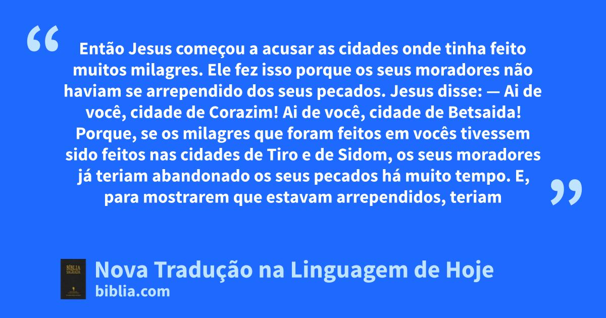 21 — Ai de você, cidade de Corazim! Ai de você, cidade de Betsaida! Porque, se os milagres que foram feitos em vocês tivessem sido feitos nas cidades de Tiro e de Sidom, os seus moradores já teriam abandonado os seus pecados há muito tempo. E, para mostrarem que estavam arrependidos, teriam vestido roupa feita de pano grosseiro e teriam jogado cinzas na cabeça!89 22 Pois eu afirmo a vocês que, no Dia do Juízo, Deus terá mais pena de Tiro e de Sidom do que de vocês, Corazim e Betsaida.23 E você, cidade de Cafarnaum, acha que vai subir até o céu? Pois será jogada no * mundo dos mortos! Porque, se os milagres que foram feitos aí tivessem sido feitos na cidade de Sodoma, ela existiria até hoje.90 24 Pois eu afirmo a vocês que, no Dia do Juízo, Deus terá mais pena de Sodoma do que de você, Cafarnaum.91
