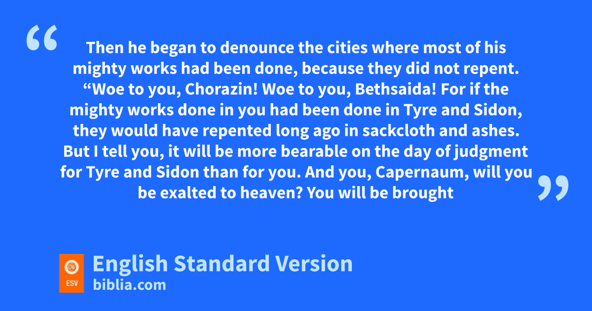 20 zThen he began to denounce the cities where most of his mighty works had been done, because they did not repent. 21 a“Woe to you, Chorazin! Woe to you, Bethsaida! For if the mighty works done in you had been done in bTyre and Sidon, they would have repented long ago in sackcloth and ashes. 22 cBut I tell you, it will be more bearable on dthe day of judgment for bTyre and Sidon than for you. 23 And you, eCapernaum, will you be exalted to heaven? You will be brought down to fHades. For if the mighty works done in you had been done in Sodom, it would have remained until this day. 24 cBut I tell you that git will be more tolerable on dthe day of judgment for the land of Sodom than for you.”