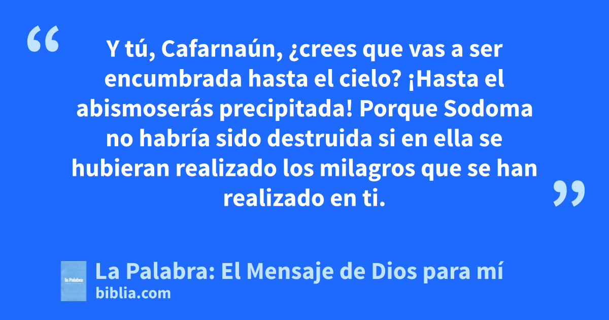 23 Y tú, Cafarnaún, ¿crees que vas a ser encumbrada hasta el cielo? ¡Hasta el abismoserás precipitada! Porque Sodoma no habría sido destruida si en ella se hubieran realizado los milagros que se han realizado en ti. 24 Por eso, les digo que, en el día del juicio, Sodoma será tratada con más clemencia que tú.