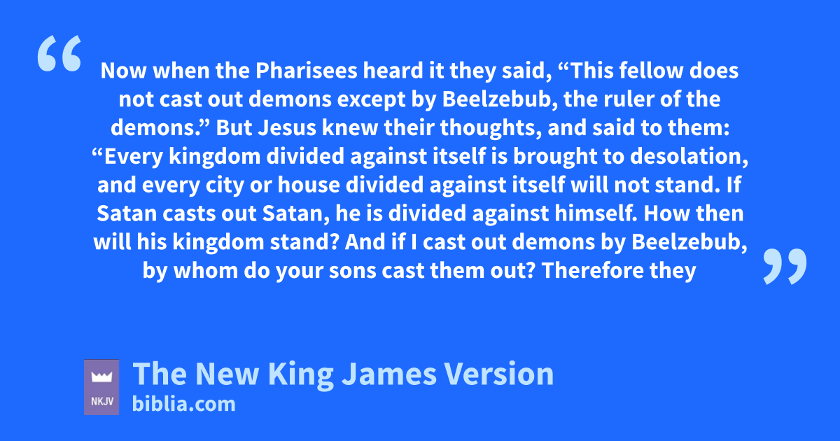 25 But Jesus tknew their thoughts, and said to them: “Every kingdom divided against itself is brought to desolation, and every city or house divided against itself will not stand. 26 If Satan casts out Satan, he is divided against himself. How then will his kingdom stand? 27 And if I cast out demons by Beelzebub, by whom do your sons cast them out? Therefore they shall be your judges. 28 But if I cast out demons by the Spirit of God, usurely the kingdom of God has come upon you. 29 vOr how can one enter a strong man’s house and plunder his goods, unless he first binds the strong man? And then he will plunder his house. 30 He who is not with Me is against Me, and he who does not gather with Me scatters abroad.