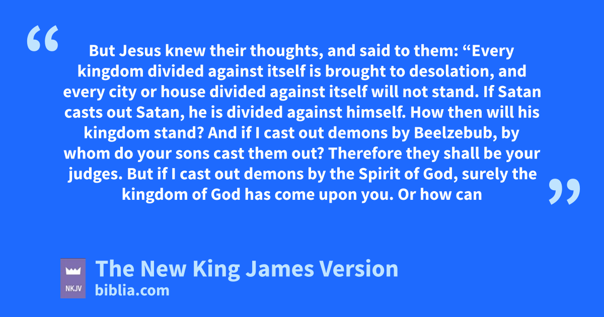 25 But Jesus tknew their thoughts, and said to them: “Every kingdom divided against itself is brought to desolation, and every city or house divided against itself will not stand. 26 If Satan casts out Satan, he is divided against himself. How then will his kingdom stand? 27 And if I cast out demons by Beelzebub, by whom do your sons cast them out? Therefore they shall be your judges. 28 But if I cast out demons by the Spirit of God, usurely the kingdom of God has come upon you. 29 vOr how can one enter a strong man’s house and plunder his goods, unless he first binds the strong man? And then he will plunder his house. 30 He who is not with Me is against Me, and he who does not gather with Me scatters abroad.
