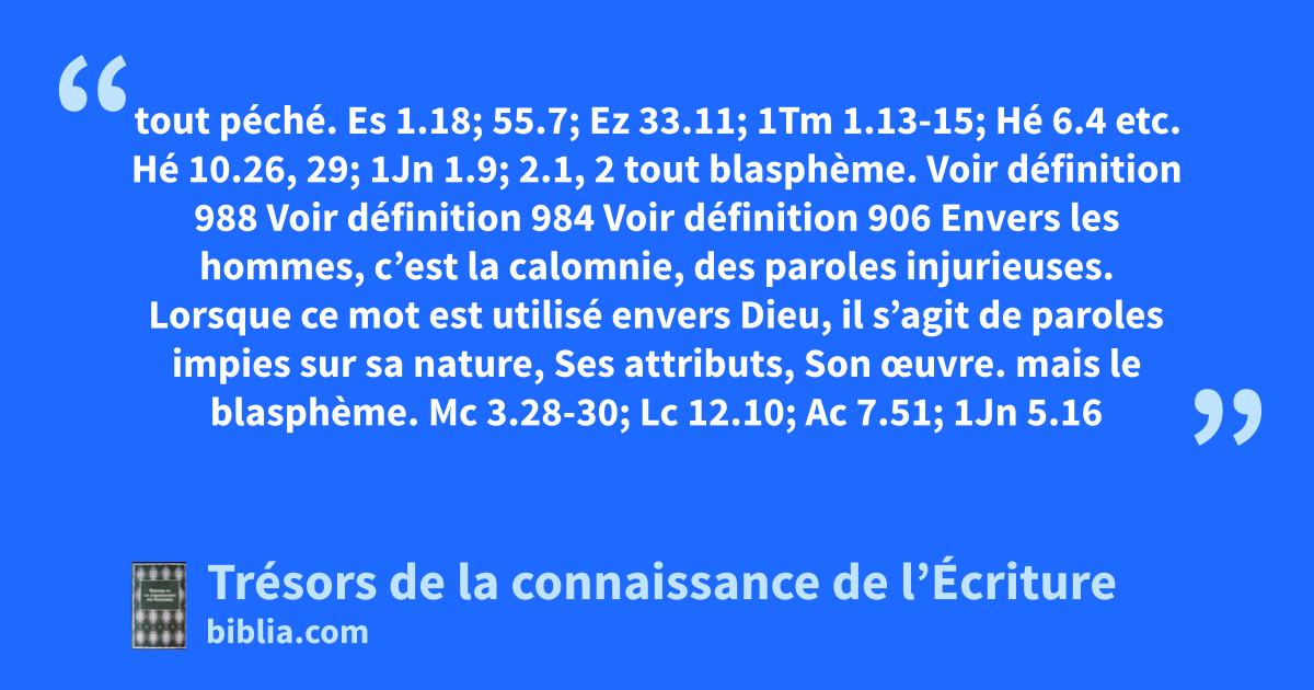 tout péché. Es 1.18; 55.7; Ez 33.11; 1Tm 1.13-15; Hé 6.4 etc. Hé 10.26, 29; 1Jn 1.9; 2.1, 2 tout blasphème. Voir définition 988 Voir définition 984 Voir définition 906 Envers les hommes, c’est la calomnie, des paroles injurieuses. Lorsque ce mot est utilisé envers Dieu, il s’agit de paroles impies sur sa nature, Ses attributs, Son œuvre. mais le blasphème. Mc 3.28-30; Lc 12.10; Ac 7.51; 1Jn 5.16