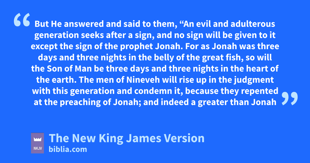 39 But He answered and said to them, “An evil and e adulterous generation seeks after a sign, and no sign will be given to it except the sign of the prophet Jonah. 40 fFor as Jonah was three days and three nights in the belly of the great fish, so will the Son of Man be three days and three nights in the heart of the earth. 41 gThe men of Nineveh will rise up in the judgment with this generation and hcondemn it, ibecause they repented at the preaching of Jonah; and indeed a greater than Jonah is here. 42 jThe queen of the South will rise up in the judgment with this generation and condemn it, for she came from the ends of the earth to hear the wisdom of Solomon; and indeed a greater than Solomon is here.