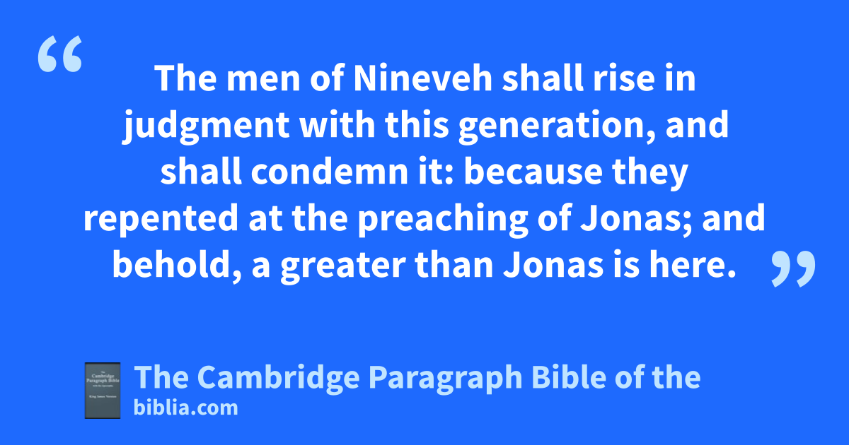 38 Then certain of the scribes and of the Pharisees answered, saying, xMaster, we would see a sign from thee. 39 But he answered and said to them, yAn evil and zadulterous generation seeketh after a sign; and there shall no sign be given to it, but the sign of the prophet Jonas: 40 for aas Jonas was three days and three nights in the whale’s belly; so shall the Son of man be three days and three nights in the heart of the earth. 41 The men of bNineveh shall rise cin judgment with this generation, and dshall condemn it: because ethey repented at the preaching of Jonas; and behold, fa greater than Jonas is here. 42 The gqueen of the south shall rise up in the judgment with this generation, and dshall condemn it: for she came from the uttermost parts of the earth to hear the wisdom of Solomon; and behold, fa greater than Solomon is here.