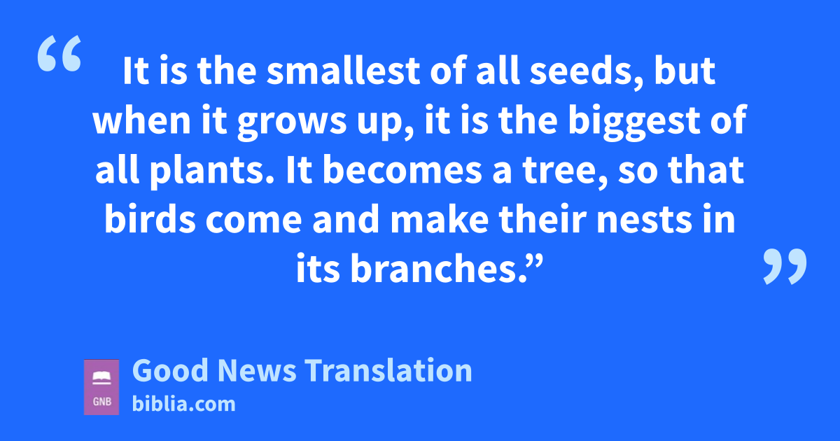 31 Jesus told them another parable: “The Kingdom of heaven is like this. A man takes a mustard seed and sows it in his field. 32It is the smallest of all seeds, but when it grows up, it is the biggest of all plants. It becomes a tree, so that birds come and make their nests in its branches.”
