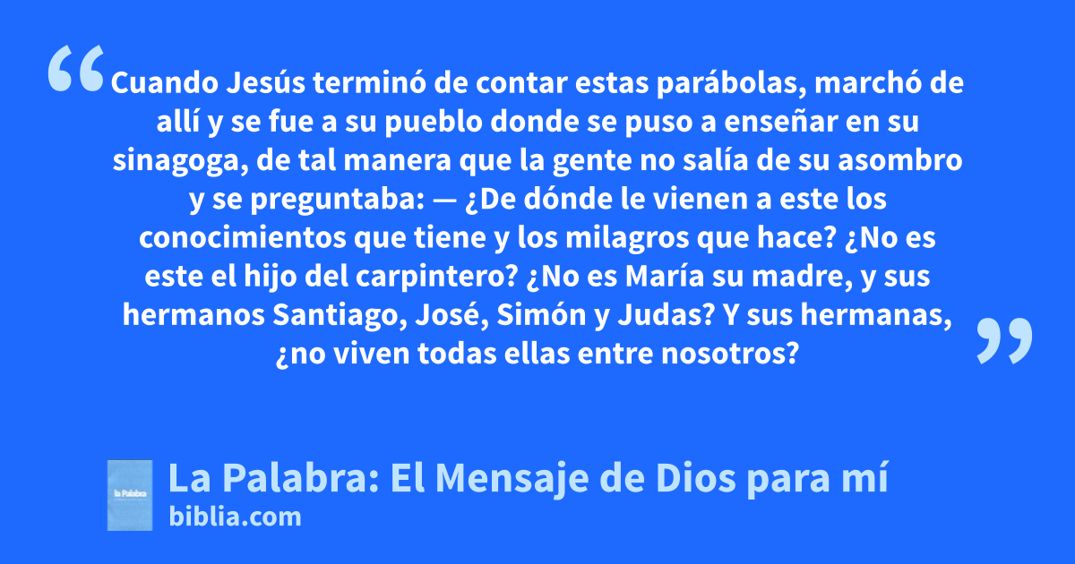 53 Cuando Jesús terminó de contar estas parábolas, marchó de allí 54 y se fue a su pueblo donde se puso a enseñar en su sinagoga, de tal manera que la gente no salía de su asombro y se preguntaba: