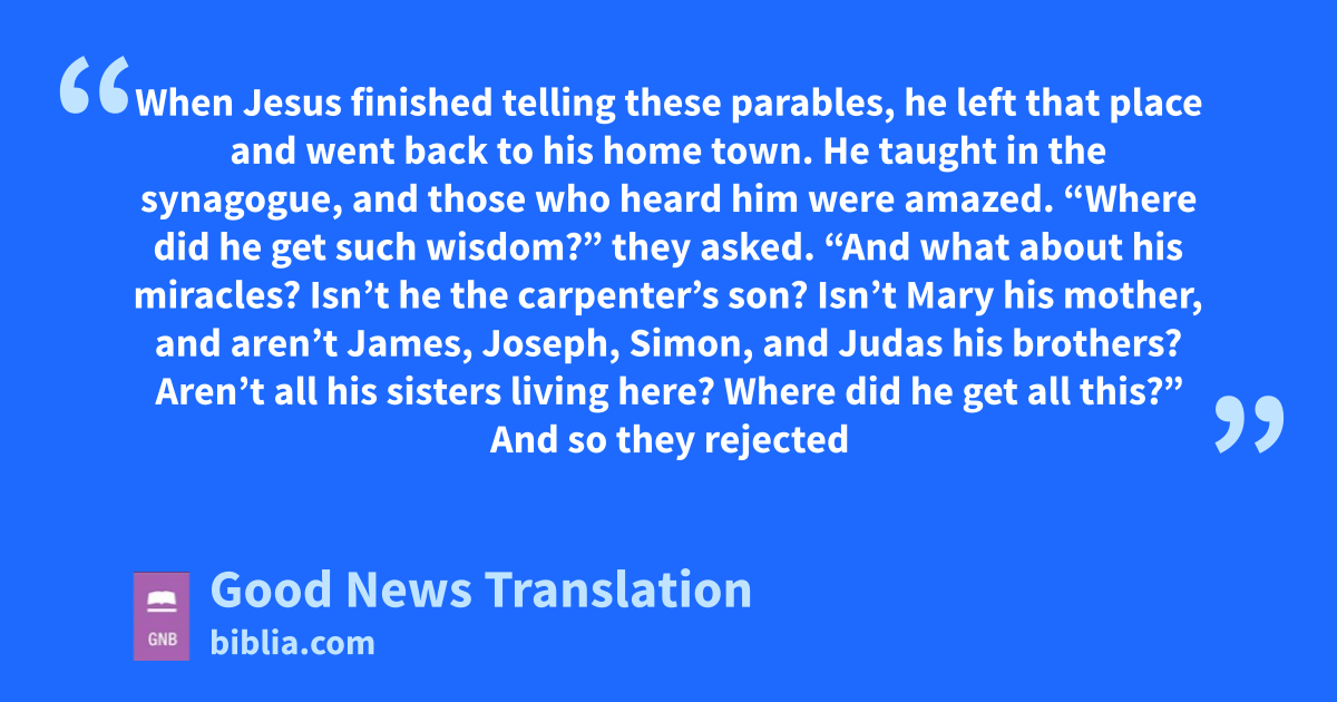 53 When Jesus finished telling these parables, he left that place 54and went back to his home town. He taught in the synagogue, and those who heard him were amazed. “Where did he get such wisdom?” they asked. “And what about his miracles? 55Isn’t he the carpenter’s son? Isn’t Mary his mother, and aren’t James, Joseph, Simon, and Judas his brothers? 56Aren’t all his sisters living here? Where did he get all this?” 57*And so they rejected him.