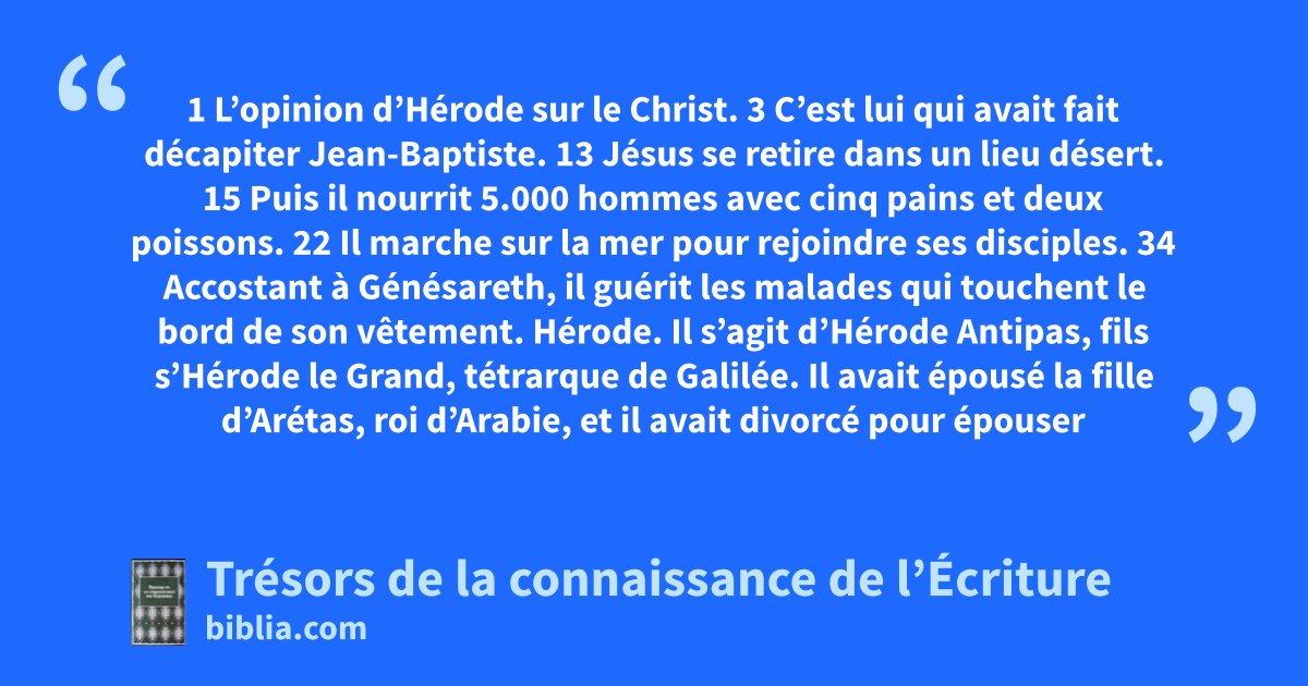 1 L’opinion d’Hérode sur le Christ. 3 C’est lui qui avait fait décapiter Jean-Baptiste. 13 Jésus se retire dans un lieu désert. 15 Puis il nourrit 5.000 hommes avec cinq pains et deux poissons. 22 Il marche sur la mer pour rejoindre ses disciples. 34 Accostant à Génésareth, il guérit les malades qui touchent le bord de son vêtement.