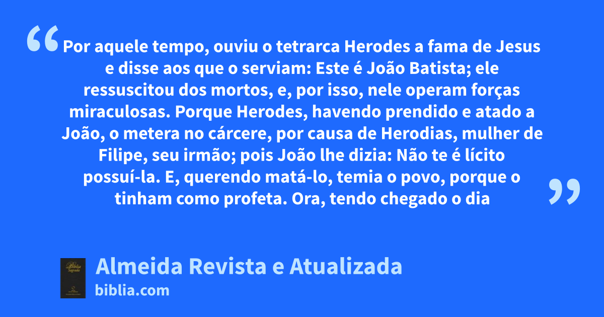 14 1 Por aquele tempo, ouviu o tetrarca Herodes a fama de Jesus 2 e disse aos que o serviam: Este é João Batista; ele ressuscitou dos mortos, e, por isso, nele operam forças miraculosas. 3 Porque Herodes, havendo prendido e atado a João, o metera no cárcere, por causa de Herodias, mulher de Filipe, seu irmão; 4 pois João lhe dizia: Não te é lícito possuí-laa.b 5 E, querendo matá-lo, temia o povo, porque o tinham como profeta. 6 Ora, tendo chegado o dia natalício de Herodes, dançou a filha de Herodias diante de todos e agradou a Herodes. 7 Pelo que prometeu, com juramento, dar-lhe o que pedisse. 8 Então, ela, instigada por sua mãe, disse: Dá-me, aqui, num prato, a cabeça de João Batista. 9 Entristeceu-se o rei, mas, por causa do juramento e dos que estavam com ele à mesa, determinou que lha dessem; 10 e deu ordens e decapitou a João no cárcere. 11 Foi trazida a cabeça num prato e dada à jovem, que a levou a sua mãe. 12 Então, vieram os seus discípulos, levaram o corpo e o sepultaram; depois, foram e o anunciaram a Jesus.