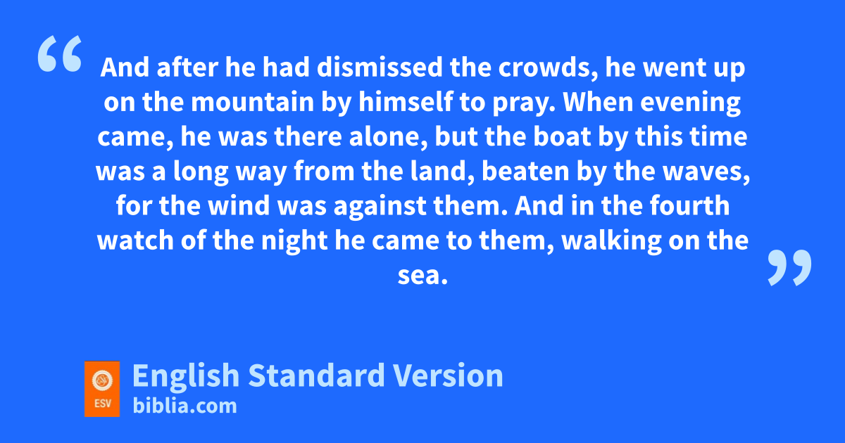 22 lImmediately he mmade the disciples get into the boat and go before him to the other side, while he dismissed the crowds. 23 And after he had dismissed the crowds, nhe went up on the mountain by himself to pray. When oevening came, he was there alone, 24 but the boat by this time was a long way2 from the land,3 beaten by the waves, for the wind was against them. 25 And lin the fourth watch of the night4 he came to them, walking on the sea. 26 But when the disciples saw him walking on the sea, pthey were terrified, and said, “It is a ghost!” and they cried out in fear. 27 But immediately Jesus spoke to them, saying, q“Take heart; it is I. qDo not be afraid.”