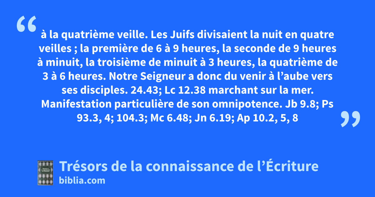 à la quatrième veille. Les Juifs divisaient la nuit en quatre veilles ; la première de 6 à 9 heures, la seconde de 9 heures à minuit, la troisième de minuit à 3 heures, la quatrième de 3 à 6 heures. Notre Seigneur a donc du venir à l’aube vers ses disciples. 24.43; Lc 12.38 marchant sur la mer. Manifestation particulière de son omnipotence. Jb 9.8; Ps 93.3, 4; 104.3; Mc 6.48; Jn 6.19; Ap 10.2, 5, 8