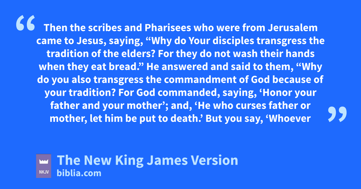 3 He answered and said to them, “Why do you also transgress the commandment of God because of your tradition? 4 For God commanded, saying, c‘Honor your father and your mother’; and, d‘He who curses father or mother, let him be put to death.’ 5 But you say, ‘Whoever says to his father or mother, e“Whatever profit you might have received from me is a gift to God”—6 then he need not honor his father 1or mother.’ Thus you have made the 2commandment of God of no effect by your tradition. 7 fHypocrites! Well did Isaiah prophesy about you, saying: