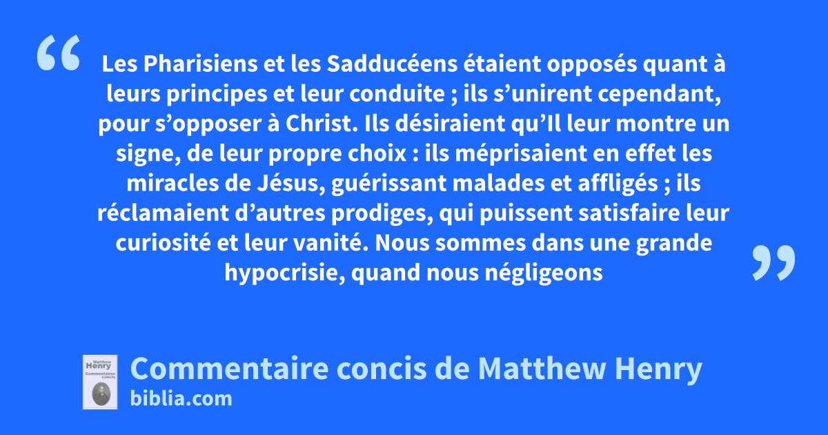 Les Pharisiens et les Sadducéens étaient opposés quant à leurs principes et leur conduite ; ils s’unirent cependant, pour s’opposer à Christ. Ils désiraient qu’Il leur montre un signe, de leur propre choix : ils méprisaient en effet les miracles de Jésus, guérissant malades et affligés ; ils réclamaient d’autres prodiges, qui puissent satisfaire leur curiosité et leur vanité.