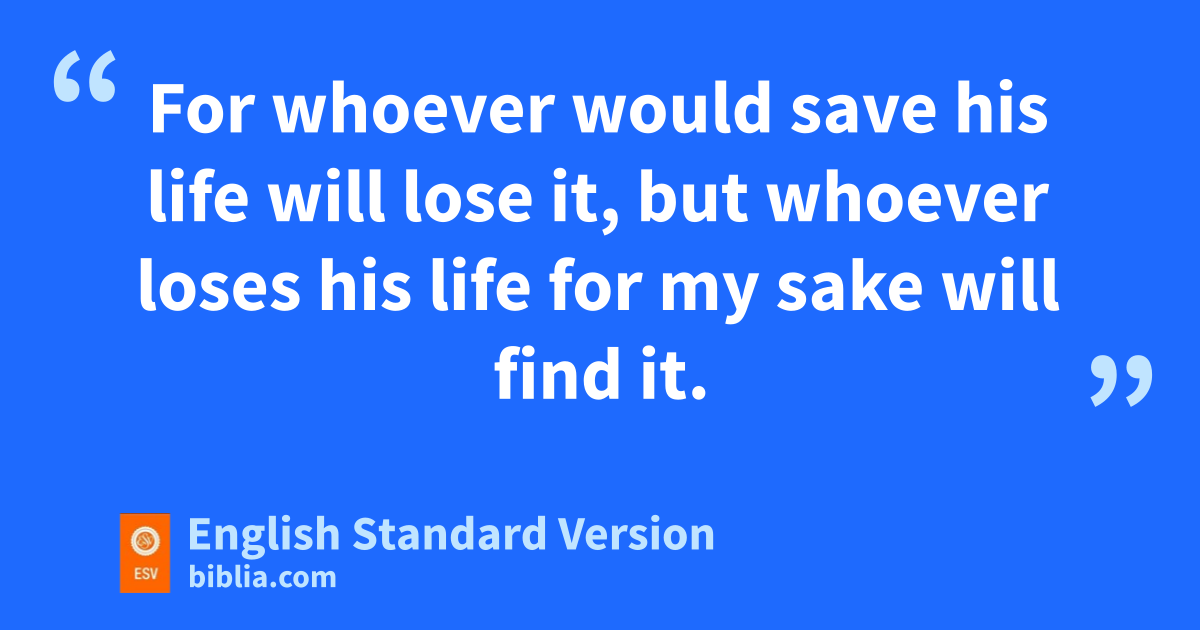 24 Then Jesus told his disciples, “If anyone would come after me, let him wdeny himself and xtake up his cross and follow me. 25 For xwhoever would save his life7 will lose it, but whoever loses his life for my sake will find it. 26 For ywhat will it profit a man if he gains the whole world and forfeits his soul? Or zwhat shall a man give in return for his soul? 27 aFor the Son of Man is going to come with bhis angels in the glory of his Father, and cthen he will repay each person according to what he has done. 28 Truly, I say to you, there are some standing here who will not dtaste death euntil they see the Son of Man fcoming in his kingdom.”