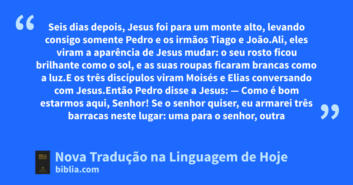1 Seis dias depois, Jesus foi para um monte alto, levando consigo somente Pedro e os irmãos Tiago e João. 2 Ali, eles viram a aparência de Jesus mudar: o seu rosto ficou brilhante como o sol, e as suas roupas ficaram brancas como a luz. 3 E os três discípulos viram Moisés e Elias conversando com Jesus. 4 Então Pedro disse a Jesus: