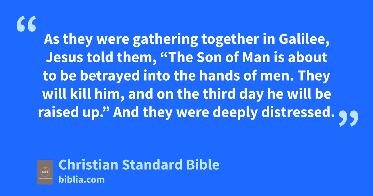22 Asp they were gathering togetherD in Galilee, Jesus told them, “The Son of Man is about to be betrayed into the hands of men. 23 They will kill him, and on the third day he will be raised up.” And they were deeply distressed.
