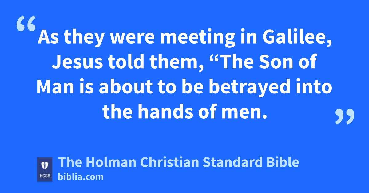 22 As r they were meeting s in Galilee, Jesus told them, “The Son of Man is about to be betrayed into the hands of men. 23 They will kill Him, and on the third day He will be raised up.” And they were deeply distressed.