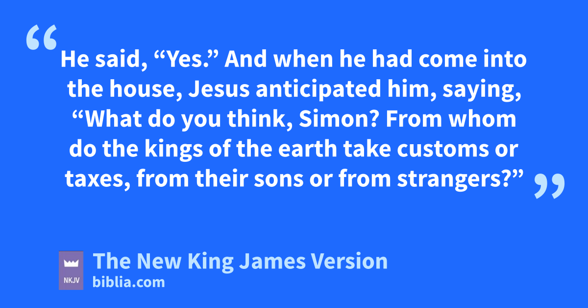 And when he had come into the house, Jesus anticipated him, saying, “What do you think, Simon? From whom do the kings of the earth take customs or taxes, from their sons or from ustrangers?”