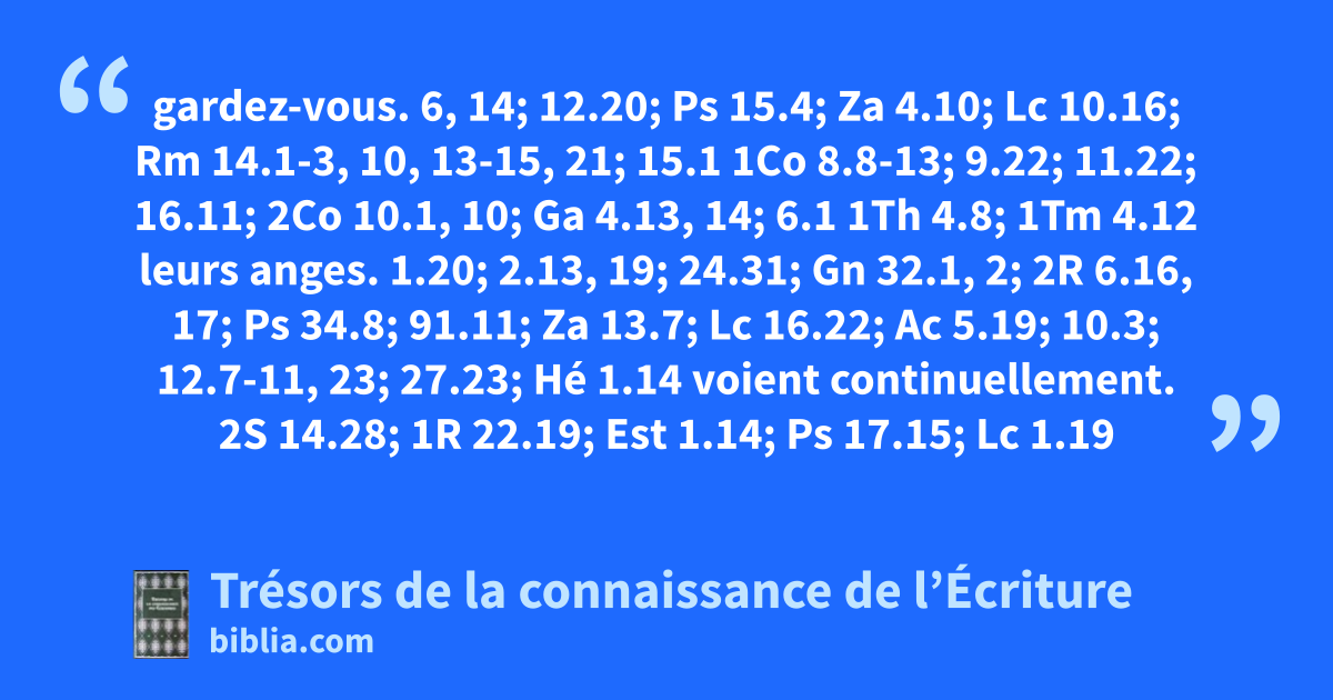 gardez-vous. 6, 14; 12.20; Ps 15.4; Za 4.10; Lc 10.16; Rm 14.1-3, 10, 13-15, 21; 15.1 1Co 8.8-13; 9.22; 11.22; 16.11; 2Co 10.1, 10; Ga 4.13, 14; 6.1 1Th 4.8; 1Tm 4.12 leurs anges. 1.20; 2.13, 19; 24.31; Gn 32.1, 2; 2R 6.16, 17; Ps 34.8; 91.11; Za 13.7; Lc 16.22; Ac 5.19; 10.3; 12.7-11, 23; 27.23; Hé 1.14 voient continuellement. 2S 14.28; 1R 22.19; Est 1.14; Ps 17.15; Lc 1.19