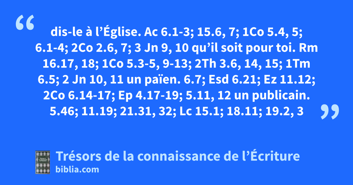 dis-le à l’Église. Ac 6.1-3; 15.6, 7; 1Co 5.4, 5; 6.1-4; 2Co 2.6, 7; 3 Jn 9, 10 qu’il soit pour toi. Rm 16.17, 18; 1Co 5.3-5, 9-13; 2Th 3.6, 14, 15; 1Tm 6.5; 2 Jn 10, 11 un païen. 6.7; Esd 6.21; Ez 11.12; 2Co 6.14-17; Ep 4.17-19; 5.11, 12 un publicain. 5.46; 11.19; 21.31, 32; Lc 15.1; 18.11; 19.2, 3