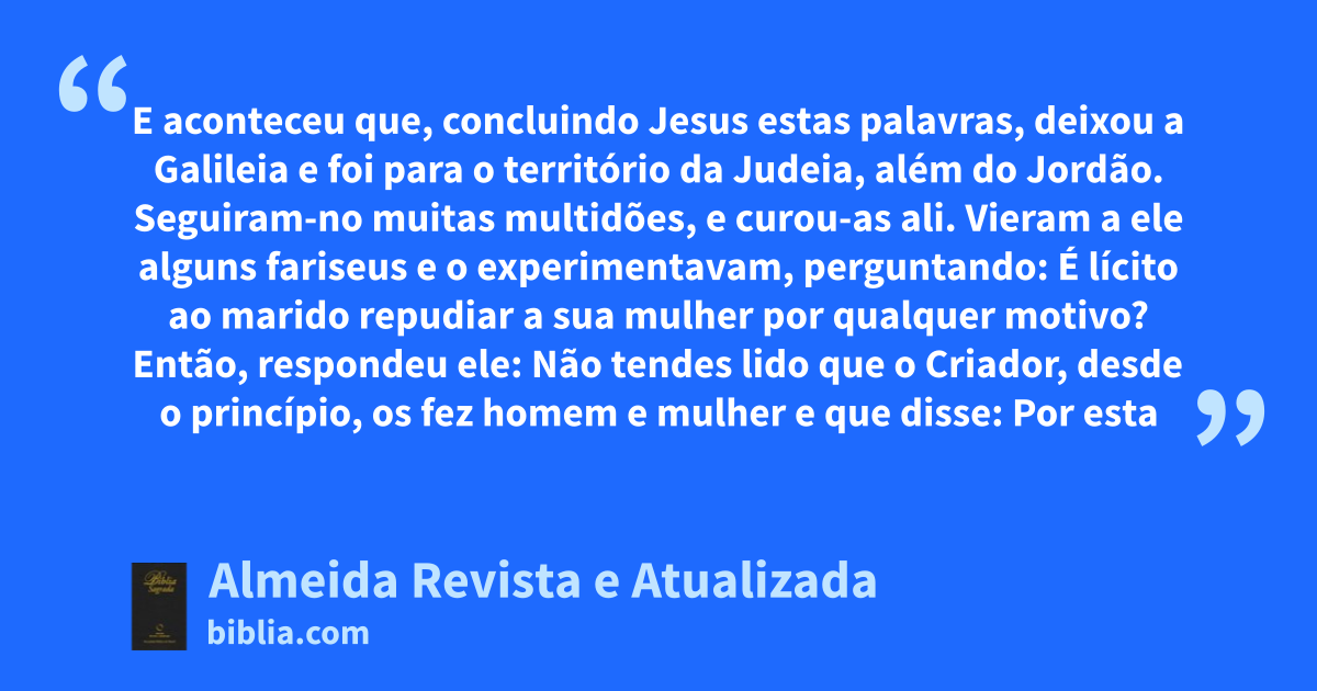 19 1 E aconteceu que, concluindo Jesus estas palavras, deixou a Galileia e foi para o território da Judeia, além do Jordão. 2 Seguiram-no muitas multidões, e curou-as ali.
